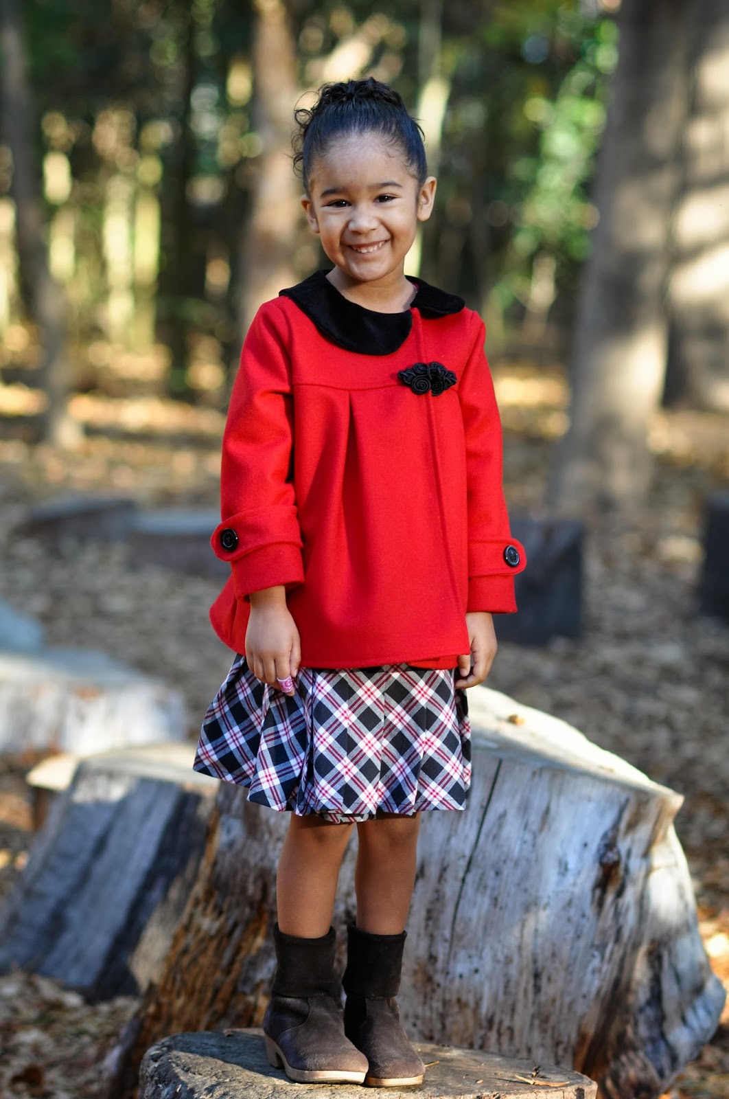 For the skirt, I had a perfect plaid in my stash.  I knew that my kid likes skirts that "twirl", so I decided that I would make a wrap/pleated skirt.  I lopped off the pattern pieces, and added a pleated lower skirt.